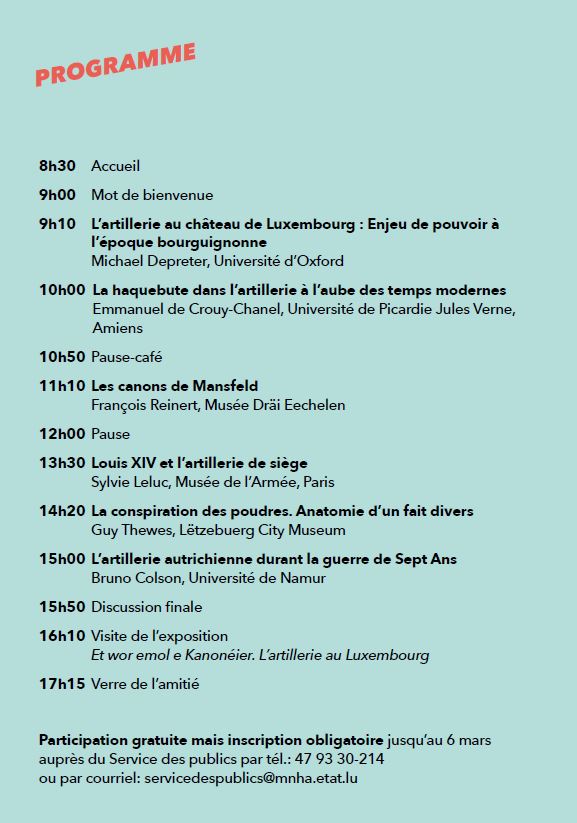 Lors des travaux préparatifs de l’exposition "Et wor emol e Kanoneier. L’artillerie au Luxembourg" au Musée Dräi Eechelen (27 juin 2019 – 22 mars 2020), la richesse insoupçonnée de cette thématique et la complexité de l’évolution de l’artillerie sont apparues au grand jour. Afin d’approfondir ce sujet, nous avons réuni six experts pour donner un aperçu de l’évolution de l’artillerie du XVe au XVIIIe siècle : son importance sous Maximilien Ier, la fabrication et la technique des haquebutes, les canons d’une forteresse à la Renaissance, les progrès de l’artillerie de siège sous Louis XIV, les magasins à poudre et l’artillerie des Habsbourg lors de la guerre de Sept Ans (1756-1763) et tout ceci avec un focus sur la forteresse de Luxembourg.